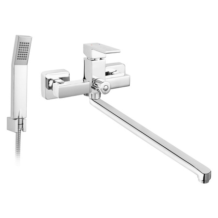 Charakterystyczna, kwadratowa bryła baterii sprawia, że jej dizajn doskonalone pasuje do nowoczesnego wnętrza. W komplecie znajdziemy prostokątną, modną 1-funkcyjną rączkę natryskową, trwały wąż prysznicowy w oplocie z metalu oraz uchwyt. Obrotowa wylewka baterii dodatkowo zwiększa jej funkcjonalność.