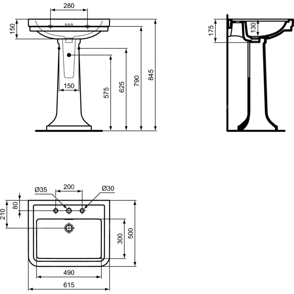 Umywalka wisząca Calla z 3 otworami na baterię wybijanymi i przelewem (z 3 otworami). Do montażu z: Calla Pedestal lub samodzielnie z syfonem Design. Zobacz listę wyposażenia opcjonalnego w katalogu/cenniku Atelier Collections.