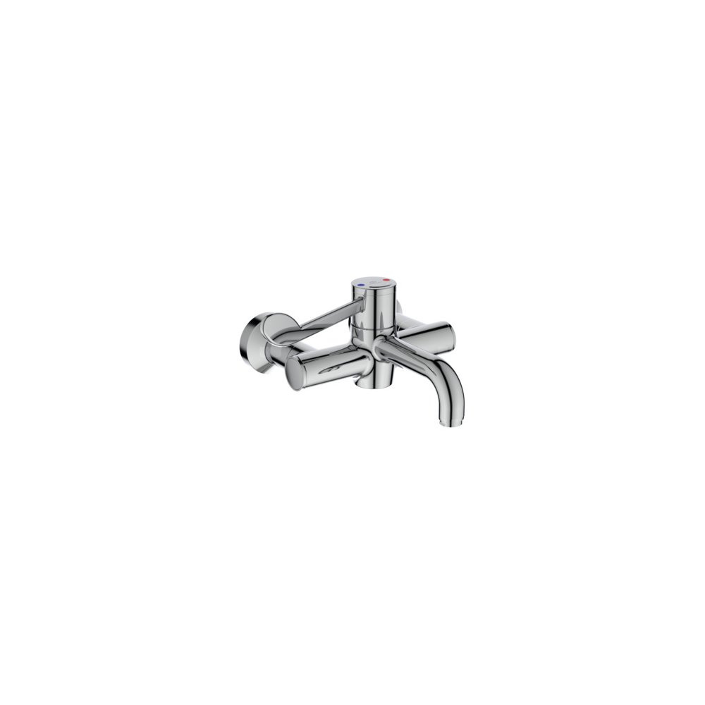 Bateria termostatyczna umywalkowa ścienna. Funkcja Cool Body, zapobiegająca ryzyku poparzenia przez nagrzany korpus baterii. Odlewany korpus z wylewką zapewniającą samoczynny odpływ wody. Metalowy uchwyt medyczny dł. 120 mm z nadrukowanymi czerwonymi i niebieskimi oznaczeniami. Wandaloodporny perlator ograniczający napowietrzenie strumienia wody. Termostatyczna głowica sekwencyjna (Cycle Valve) z ogranicznikiem temperatury. Funcja dezynfekcji termicznej. Bateria z zaworami zwrotnymi. Ukryte przyłącza mimośrodowe baterii. Klasa akustyczna 1. Zgodna z EN817.