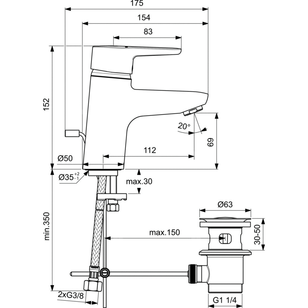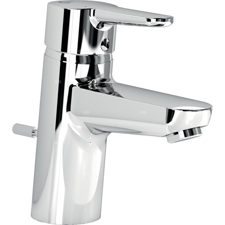 Bateria umywalkowa Connect Blue z korkiem automatycznym. Głowica IS 40 mm CLICK z funkcją ECO i ograniczeniem temperatury wody. Wężyki przyłączeniowe typu PEX G3/8". Aerator typu Cscade z ogranicznikiem przepływu wody do 5 l/min. Metalowy uchwyt z nadrukowanymi czerwonymi i niebieskimi oznaczeniami. Metalowy korek automatyczny.