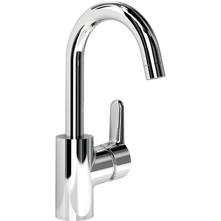 Bateria umywalkowa Connect Blue z rurową wylewką R145 (rotacja 120°). Głowica 40 mm CLICK z funkcją ECO i ograniczeniem temperatury wody. Wężyki przyłączeniowe typu PEX G3/8". Areator typu Cascade M22x1. Metalowy uchwyt z nadrukowanymi czerwonymi i niebieskimi oznaczeniami. Brak metalowego korka automatycznego.