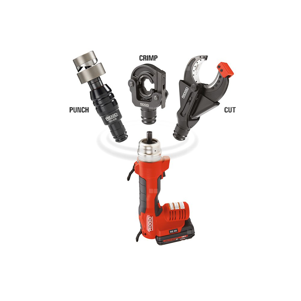 Najbardziej uniwersalne elektronarzędzie na świecie. Elektronarzędzie RE 60 firmy RIDGID® jest wyposażone w nasz unikalny system szybkiej wymiany narzędzi QuickChange System™, który pozwala szybko i łatwo wymieniać głowice tnące, do zaciskania i wykonywania otworów. Teraz większość zadań możesz wykonać za pomocą jednego innowacyjnego narzędzia. Nie musisz już szukać różnych narzędzi w samochodzie. Niezależnie od tego, czy potrzebujesz przeciąć przewód, zacisnąć końcówki, czy wykonać otwór, elektronarzędzie RE 60 pozwoli zwiększyć produktywność i wydajność w miejscu pracy. Siła 60 kN pozwala zaciskać końcówki do 300 mm², przecinać przewody o średnicy do 50 mm i wykonywać otwory w stali miękkiej o grubości do 3 mm. Funkcja automatycznego cofania bijaka podczas przecinania i zaciskania. Najdłuższy na rynku przedział serwisowy (32 000 cykli). Obrót głowicy o 360°. Jasna dioda LED w kolorze białym oświetla miejsce pracy. Gumowy uchwyt zapewnia doskonały komfort i kontrolę. Taśmy nylonowe zabezpieczające urządzenie. Wytrzymała walizka formowana rozdmuchowo ułatwia transport i przechowywanie. Wyłącznik zasilania na potrzeby wymiany matryc lub głowic. Zasilanie za pomocą platformy akumulatorów litowych Advanced Lithium RIDGID 18 V, Przybliżony czas cyklu - 5 sekund, Częstotliwość przeglądów - 32 000 cykli, Masa - 3,2 kg z akumulatorem