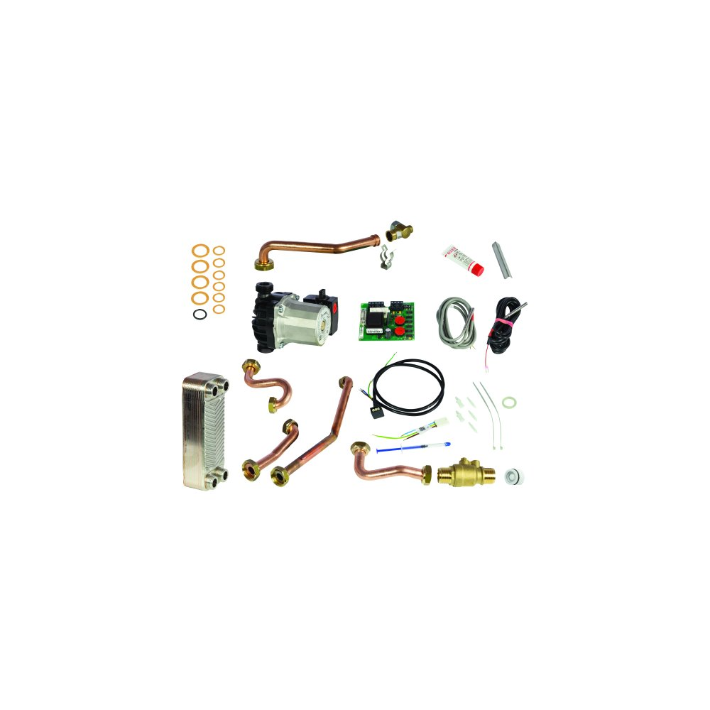Zestaw wspomagania solarnego zawiera pompę recyrkulacyjną, wymiennik płytowy, płytę sterującą z kompletem czujników, zawory przyłączeniowe.