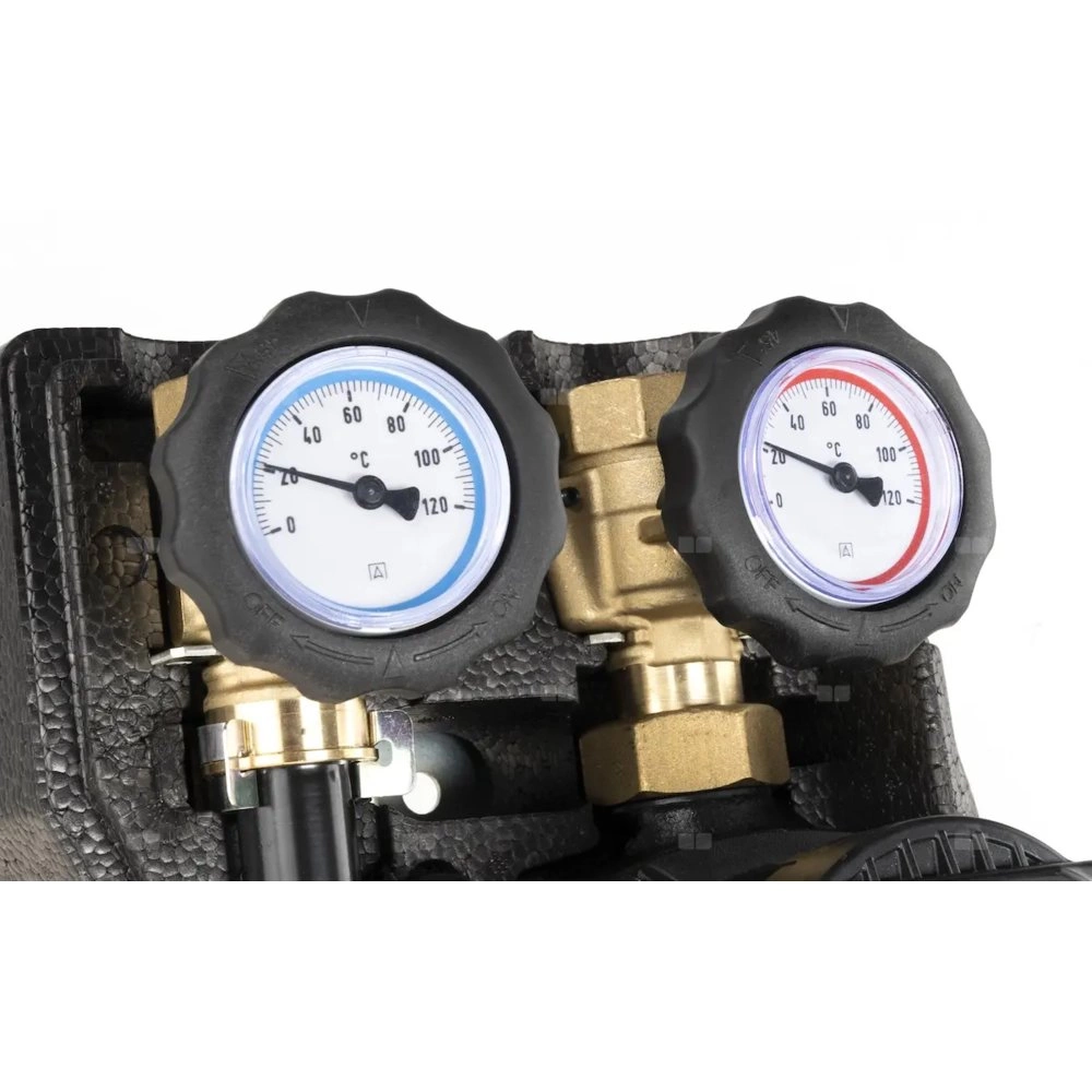 - Wyposażona w niezbędne komponenty: termometry, zawór zwrotny, zawory odcinające na zasilaniu i powrocie, zawór odcinający przed pompą oraz izolację termiczną.