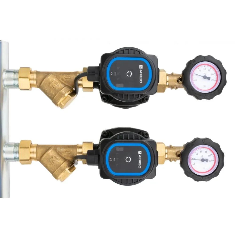 - Zawory odcinające ze zintegrowanymi termometrami do kontroli temperatury medium na każdym przyłączu.