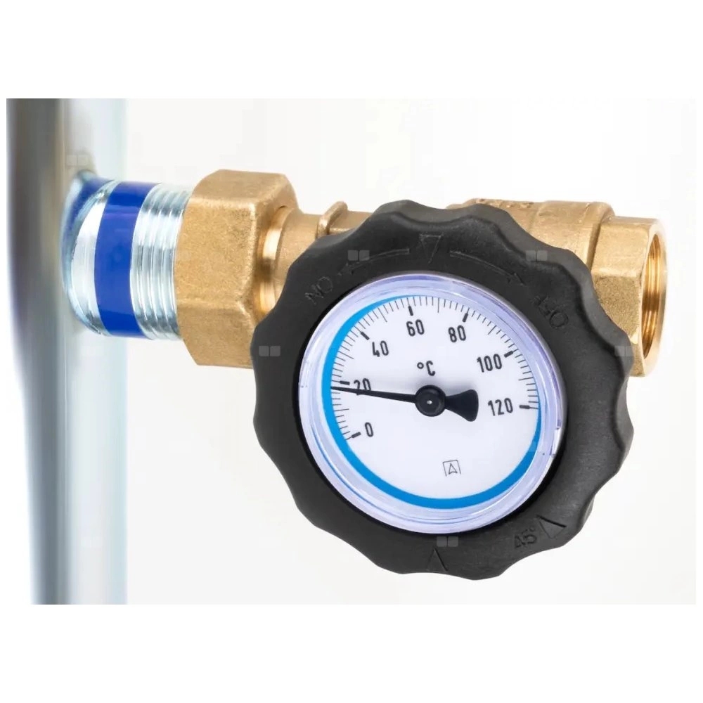 - Zawór zwrotny wbudowany w zawór odcinający z niebieskim termometrem.