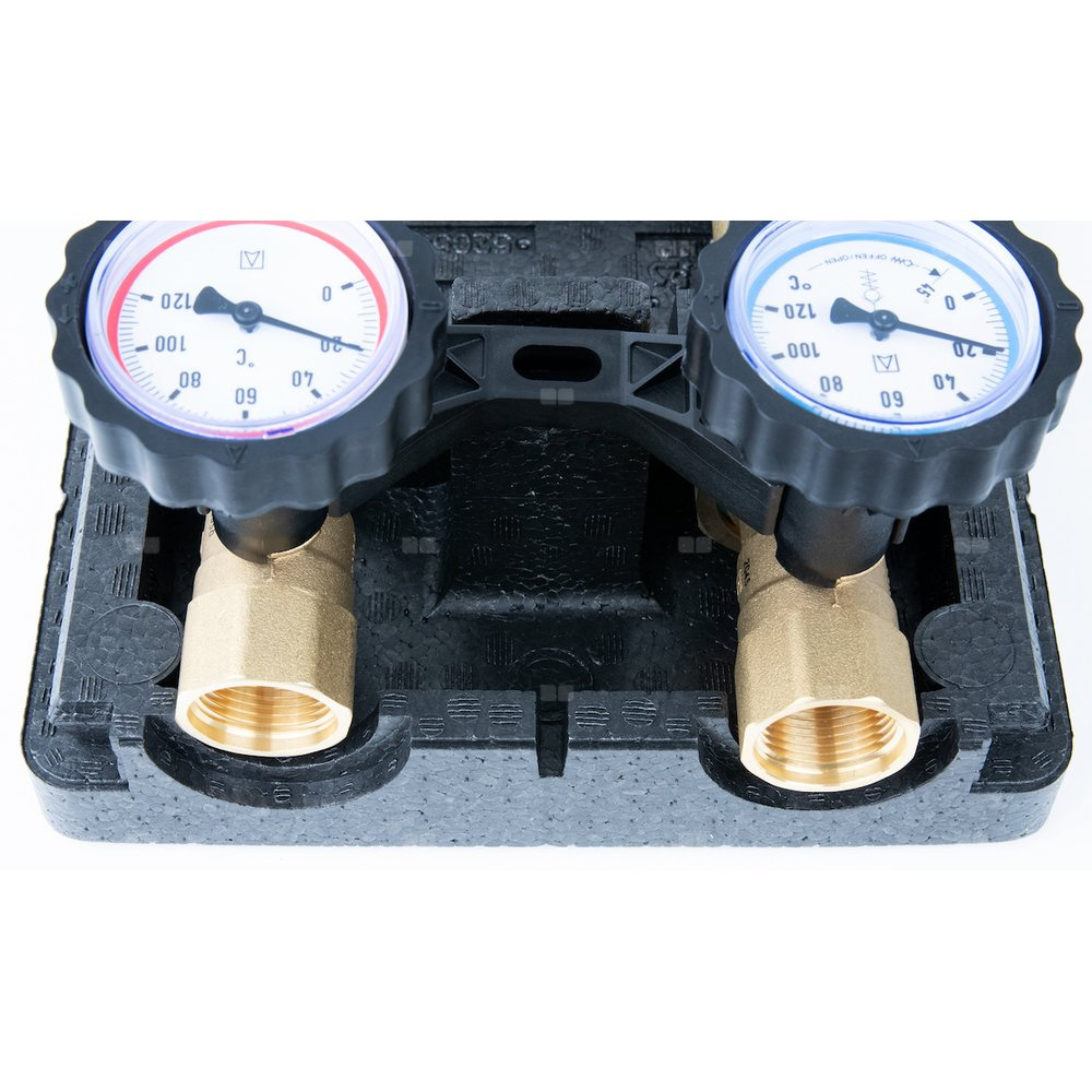 Wyposażona w niezbędne komponenty: termometry, zawór zwrotny, zawory odcinające na zasilaniu i powrocie, zawór odcinający przed pompą i izolację termiczną.