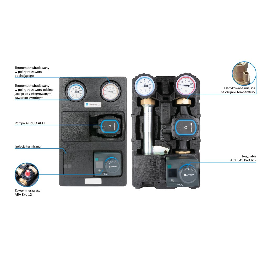 Zainstalowany zawór mieszający ARV Kvs12, pompa AFRISO APH 25-7/180 oraz regulator ACT 343 ProClick (stałotemperaturowy, 230 V AC, 120 s).