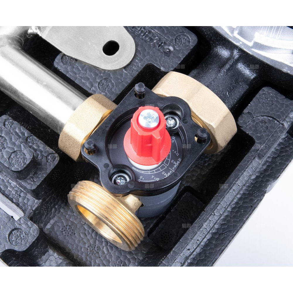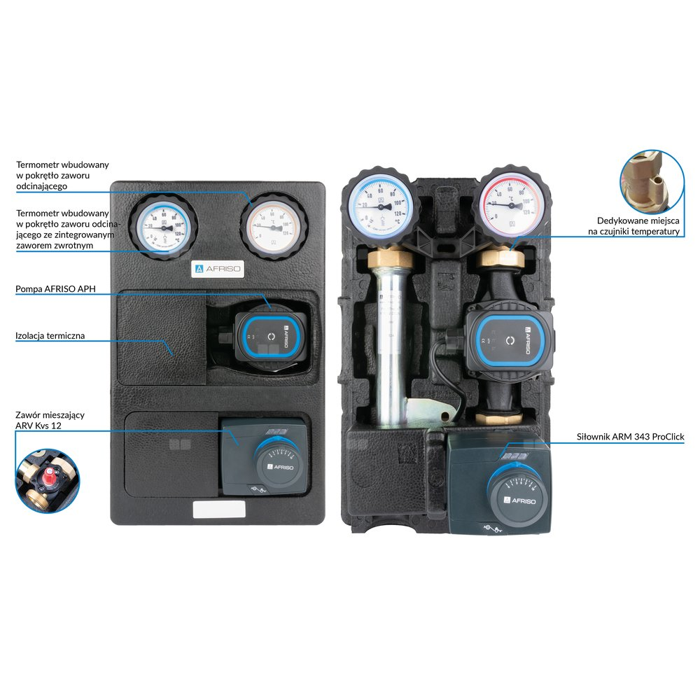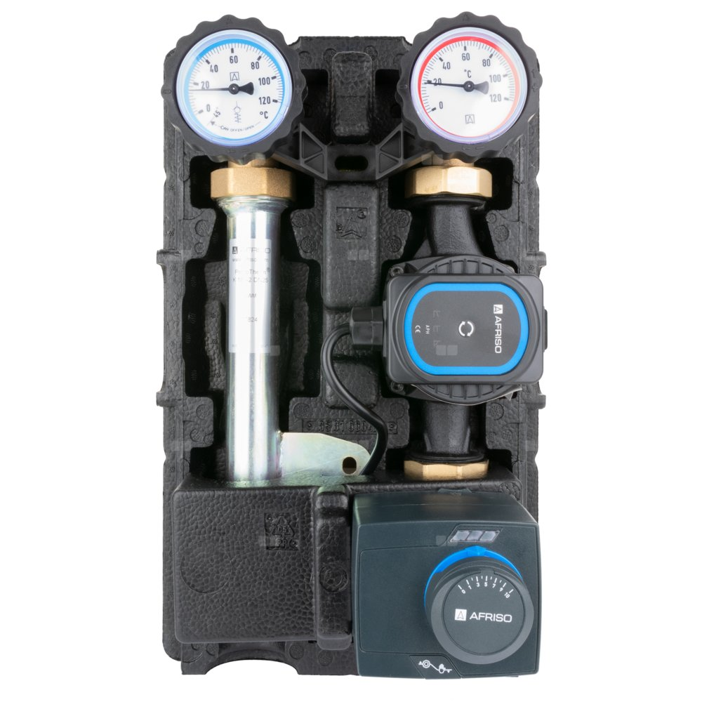 Zainstalowany zawór mieszający ARV Kvs12, pompa AFRISO APH 25-7/180 oraz siłownik ARM 343 ProClick (3-pkt., 230 V, 120 s).