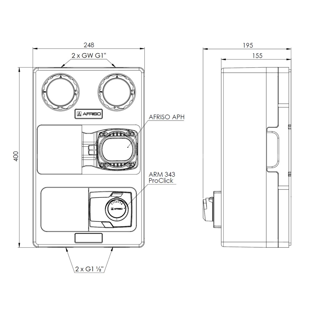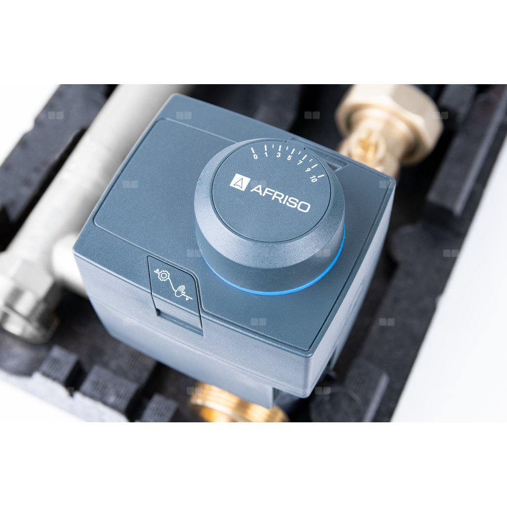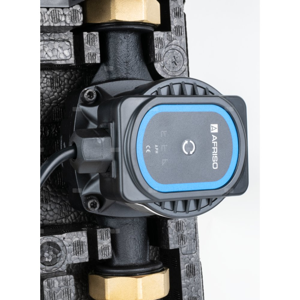 Grupa pompowa AFRISO PrimoTherm K 180-2 DN 25 AP 3-WM-SM GZ x GW 1 1/2'' x 1'', z zaworem mieszającym, z izolacją, z pompą obiegową AFRISO APH 361 25-7/180 mm, z siłownikiem arm 343 proclick