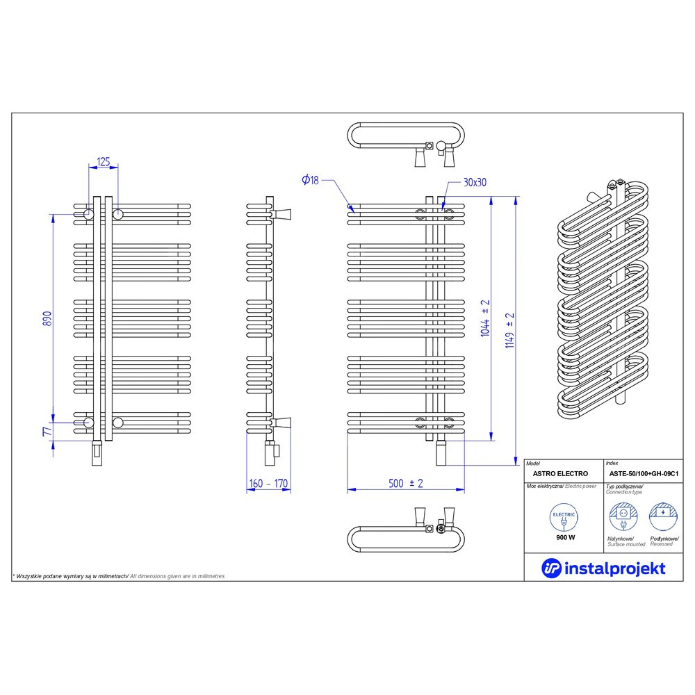 Grzejnik elektryczny (suszarka) INSTAL-PROJEKT Astro Electro, wym. 1044 (1149 z grzałką)/500 mm, kolor czarny, moc 900 W