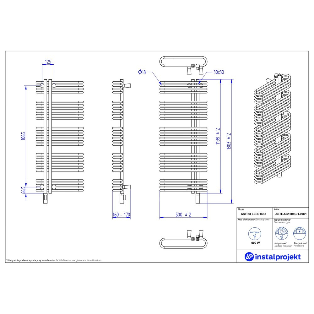 Grzejnik elektryczny (suszarka) INSTAL-PROJEKT Astro Electro, wym. 1198 (1303 z grzałką)/500 mm, kolor czarny, moc 900 W