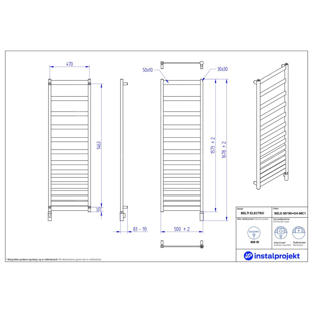 Grzejnik elektryczny (suszarka) INSTAL-PROJEKT BELTI ELECTRO, wym. 1573 (1678 z grzałką)/500 mm, kolor biały mat, moc 600 W