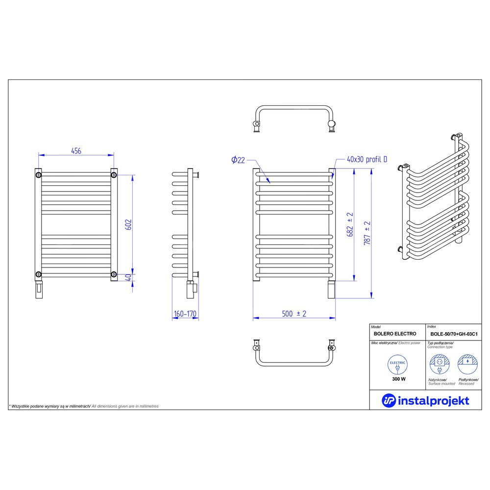 Grzejnik elektryczny (suszarka) INSTAL-PROJEKT Bolero Electro, wym. 682 (787 z grzałką)/500 mm, kolor biały połysk, moc 300 W