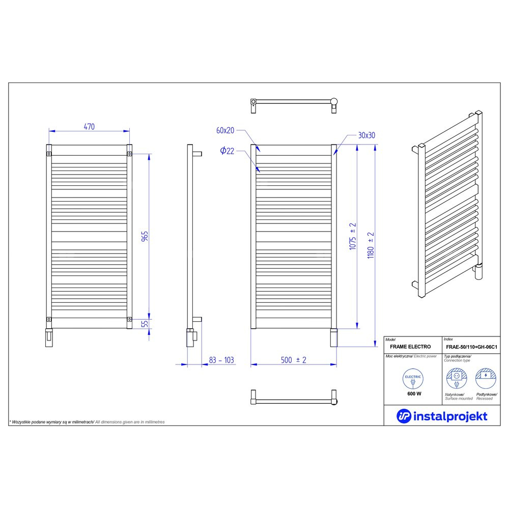 Grzejnik elektryczny (suszarka) INSTAL-PROJEKT Frame Electro, wym. 1075 (1180 z grzałką)/500 mm, kolor biały mat, moc 600 W