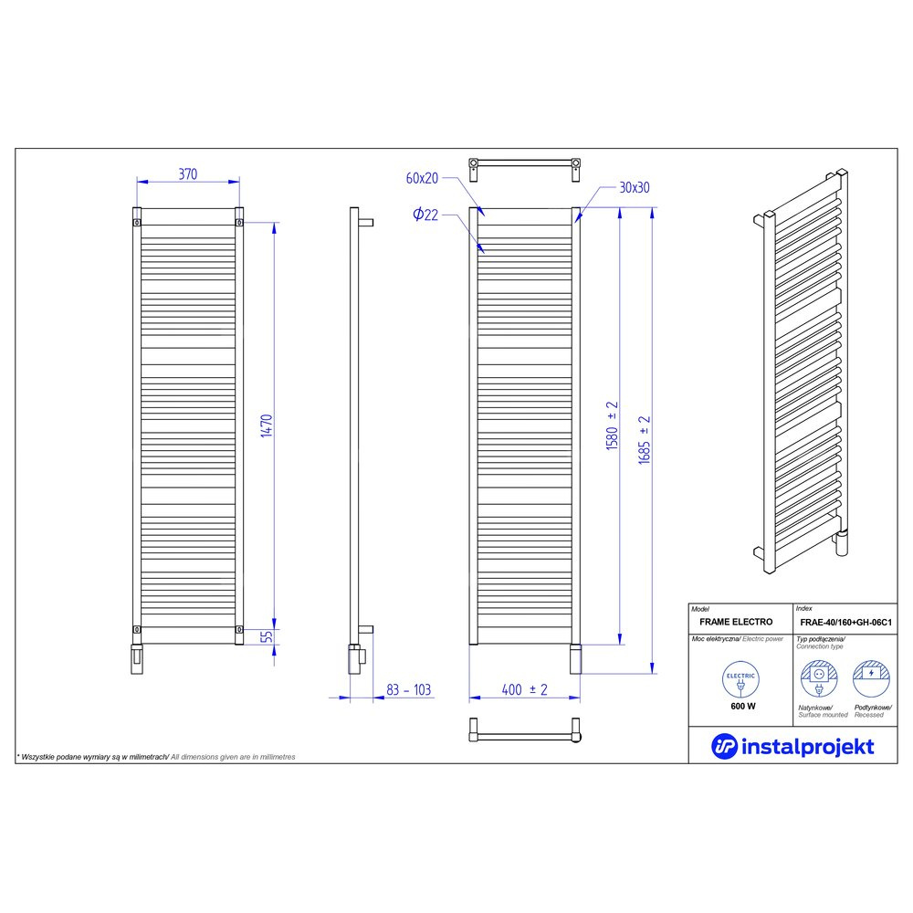 Grzejnik elektryczny (suszarka) INSTAL-PROJEKT Frame Electro, wym. 1580 (1685 z grzałką)/400 mm, kolor czarny, moc 600 W