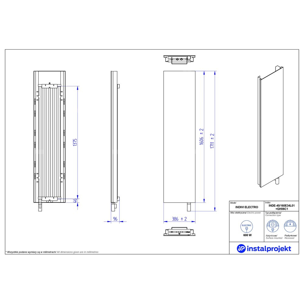 Grzejnik elektryczny (suszarka) INSTAL-PROJEKT Indivi Electro, wym. 1606 (1711 z grzałką)/386 mm, moc 600 W