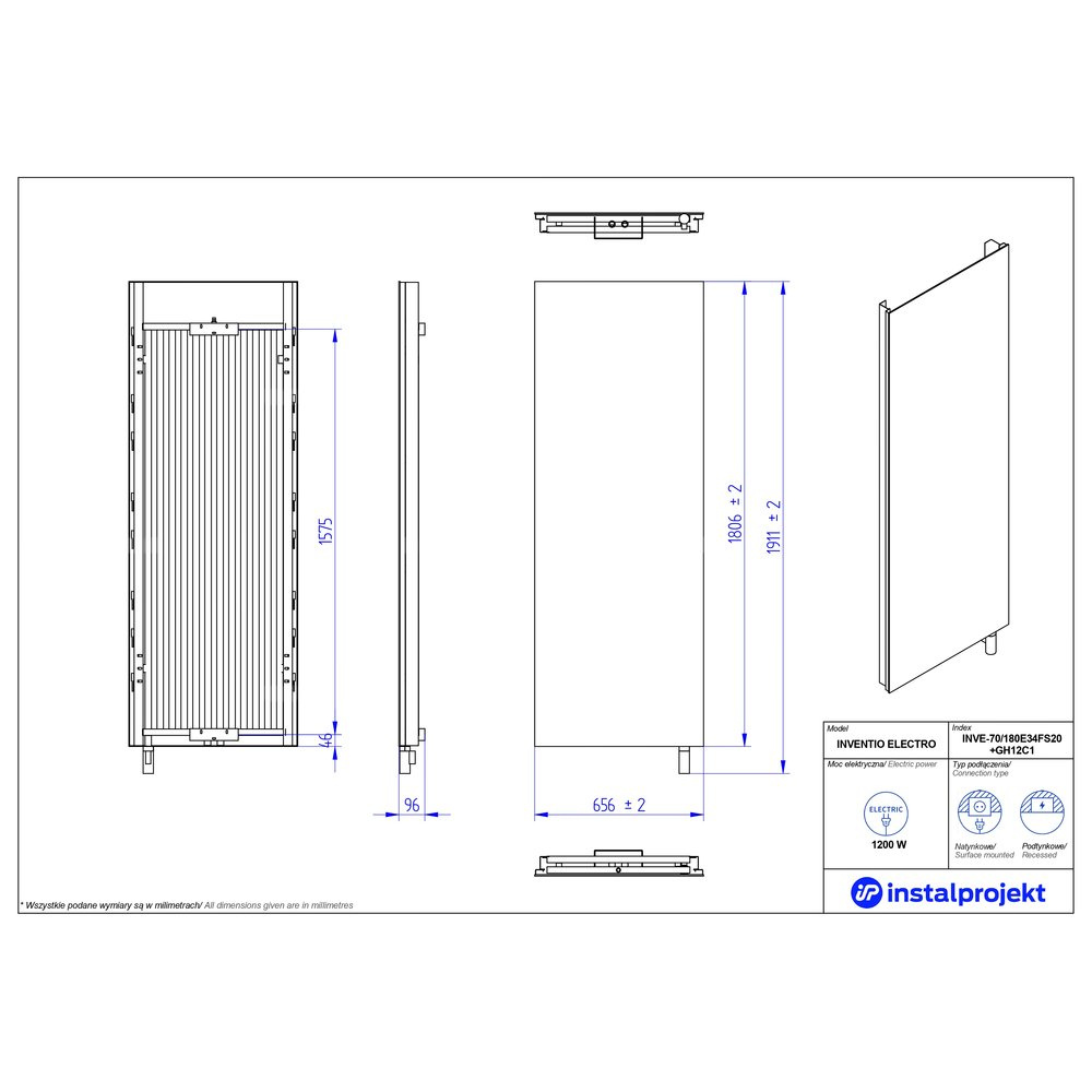 Grzejnik elektryczny (suszarka) INSTAL-PROJEKT INVENTIO ELECTRO, wym. 1806 (1911 z grzałką)/656 mm, moc 1200 W