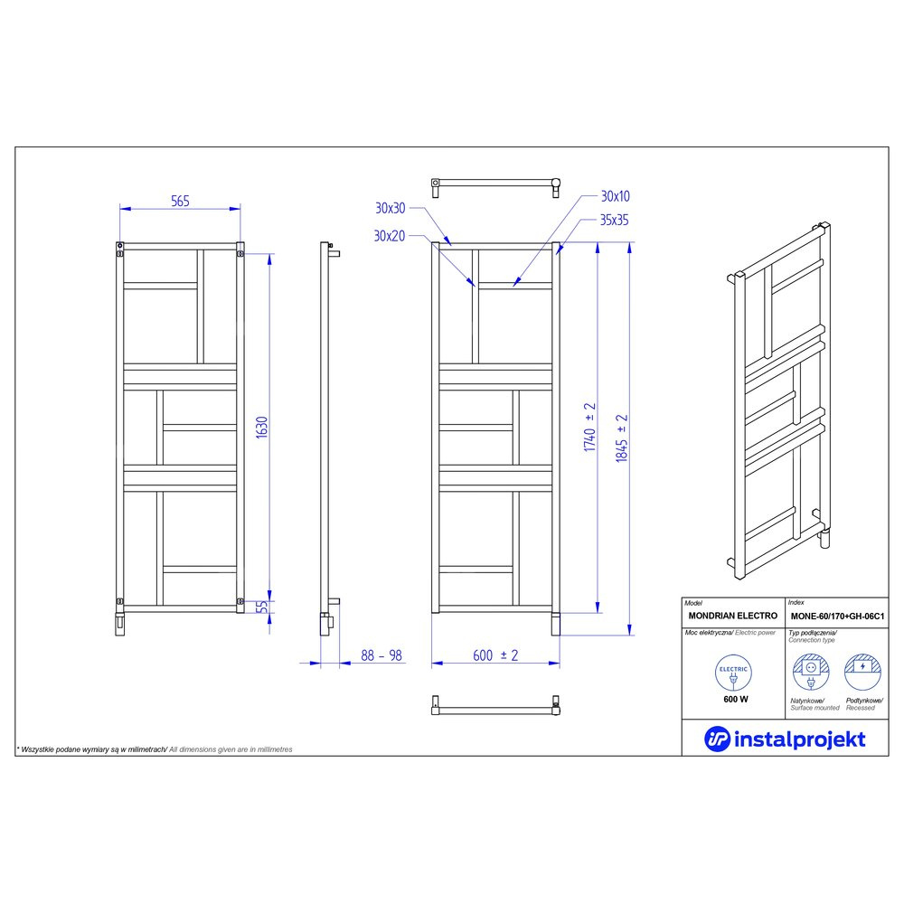 Grzejnik elektryczny (suszarka) INSTAL-PROJEKT Mondrian Electro, wym. 1740 (1845 z grzałką)/600 mm, kolor biały połysk, moc 600 W
