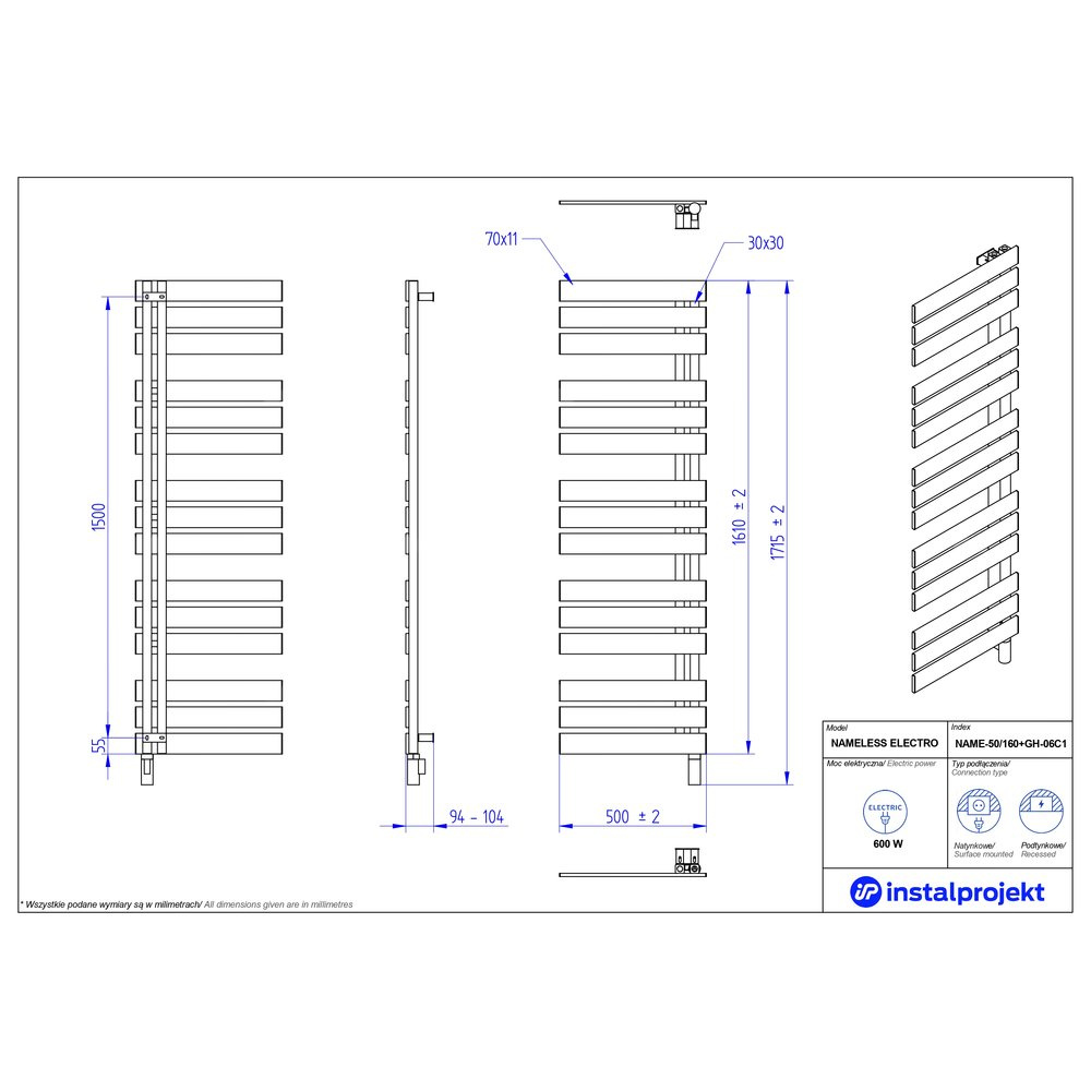 Grzejnik elektryczny (suszarka) INSTAL-PROJEKT Nameless Electro, wym. 1610 (1715 z grzałką)/500 mm, kolor biały mat, moc 600 W