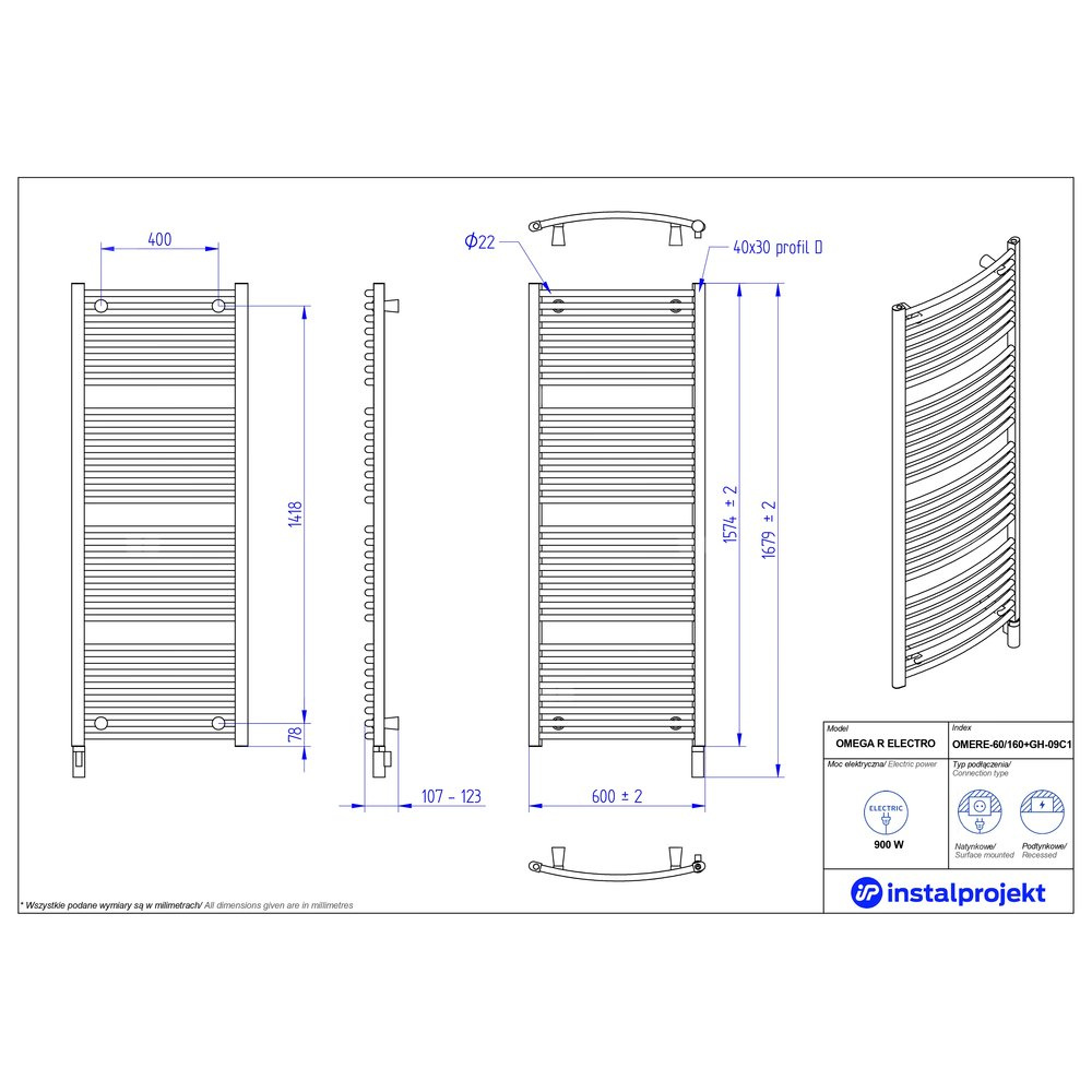 Grzejnik elektryczny (suszarka) INSTAL-PROJEKT OMER ELECTRO, wym. 1574 (1679 z grzałką)/600 mm, kolor biały połysk, moc 900 W