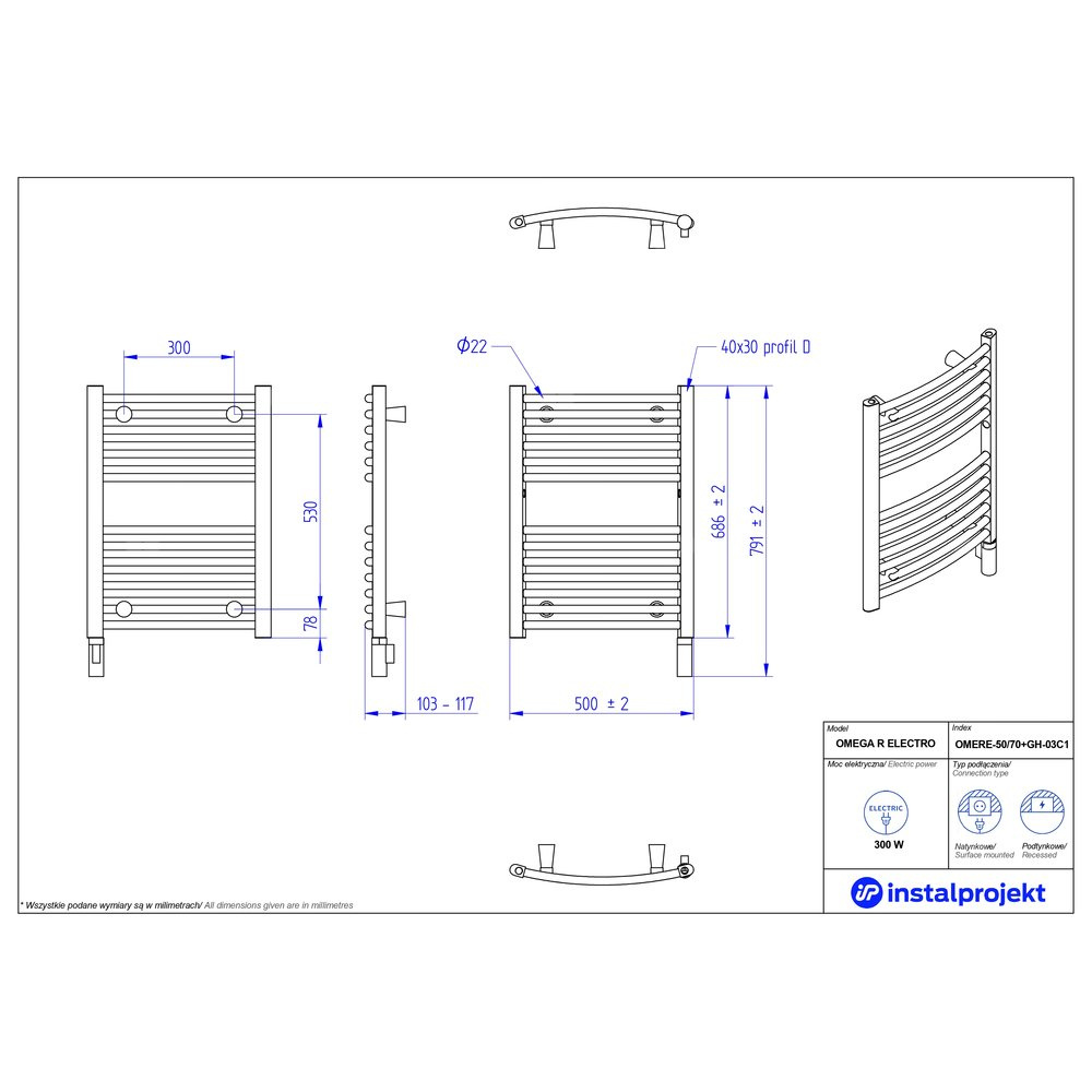 Grzejnik elektryczny (suszarka) INSTAL-PROJEKT OMER ELECTRO, wym. 686 (791 z grzałką)/500 mm, kolor biały połysk, moc 300 W