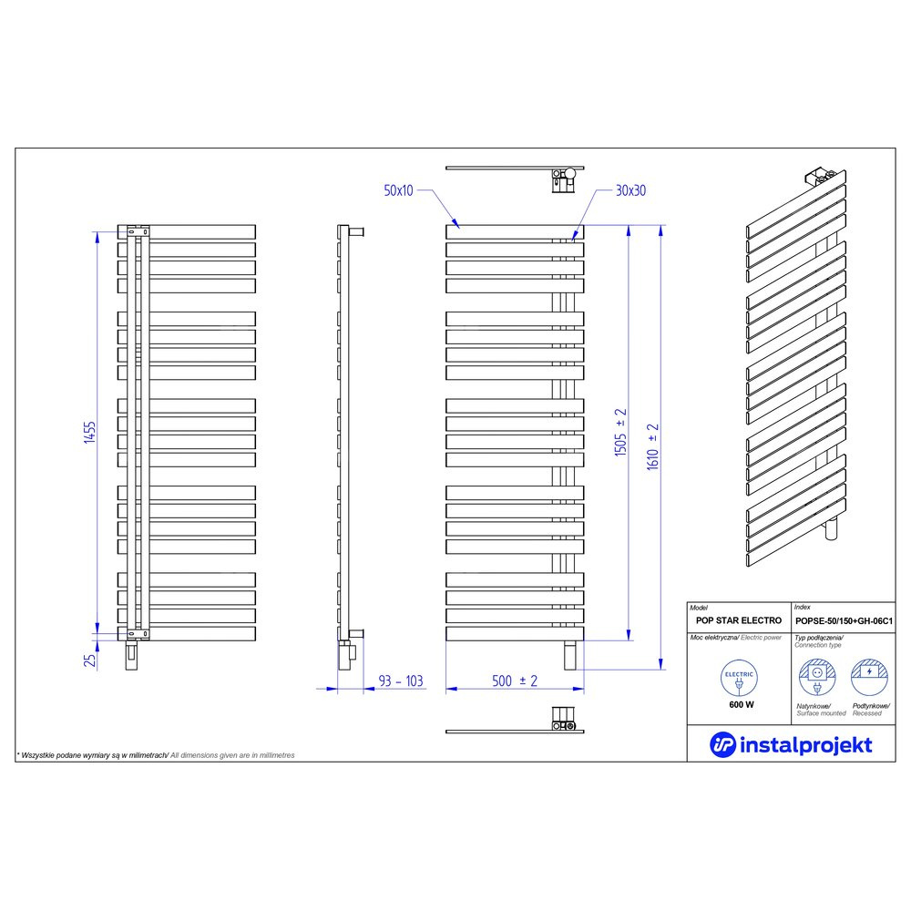 Grzejnik elektryczny (suszarka) INSTAL-PROJEKT Pop Star Electro, wym. 1505 (1610 z grzałką)/500 mm, kolor czarny, moc 600 W