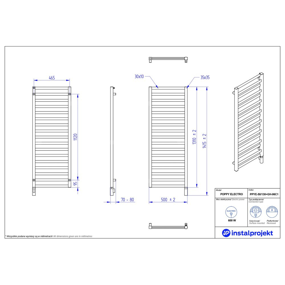Grzejnik elektryczny POPPY ELECTRO to nowoczesne wydanie dobrze znanej drabinki. Oryginalności dodaje mu dwurzędowość poziomych, wąskich profili o prostokątnym przekroju. Wprowadza do wnętrz niezwykle modny, geometryczny akcent. Kształtowniki dodają przestronności, a zamknięta forma odpowiada za poczucie harmonii i spokoju. Grzejnik dostępny w czarnym i białym kolorze, w wersji matowej, z połyskiem i widoczną strukturą materiału ale również we wszystkich 23 kolorach z palety IP. Możliwe podłączenie podtynkowe, dzięki któremu urządzenie niejako staje się integralną częścią, bez wystających przewodów, tworząc piękny efekt spójności.