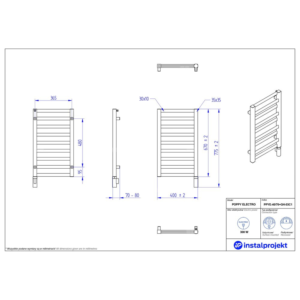 Grzejnik elektryczny (suszarka) INSTAL-PROJEKT Poppy Electro, wym. 670 (775 z grzałką)/400 mm, kolor czarny,  moc 300 W