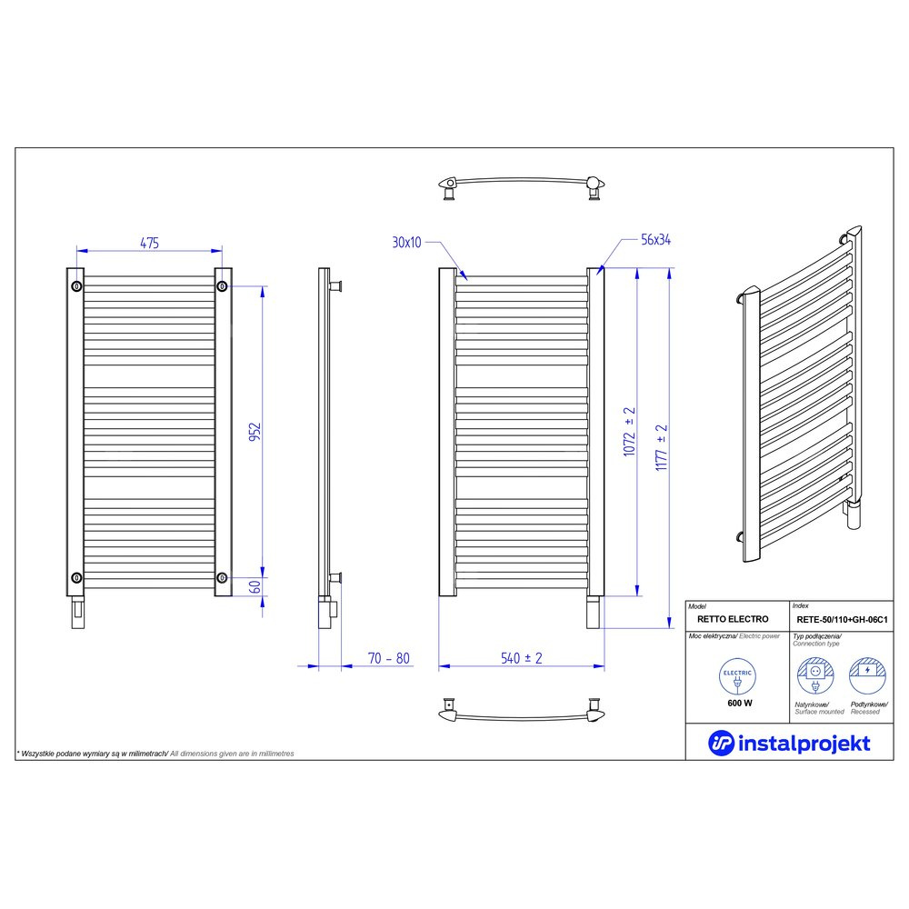 Grzejnik elektryczny (suszarka) INSTAL-PROJEKT Retto Electro, wym. 1072 (1177 z grzałką)/540 mm, kolor biały połysk, moc 600 W
