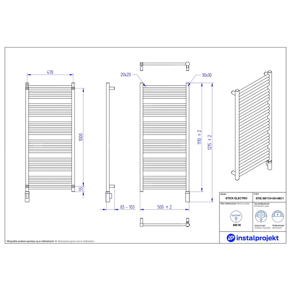 Grzejnik elektryczny (suszarka) INSTAL-PROJEKT Stick Electro, wym. 1110 (1215 z grzałką)/500 mm, kolor czarny mat, moc 600 W