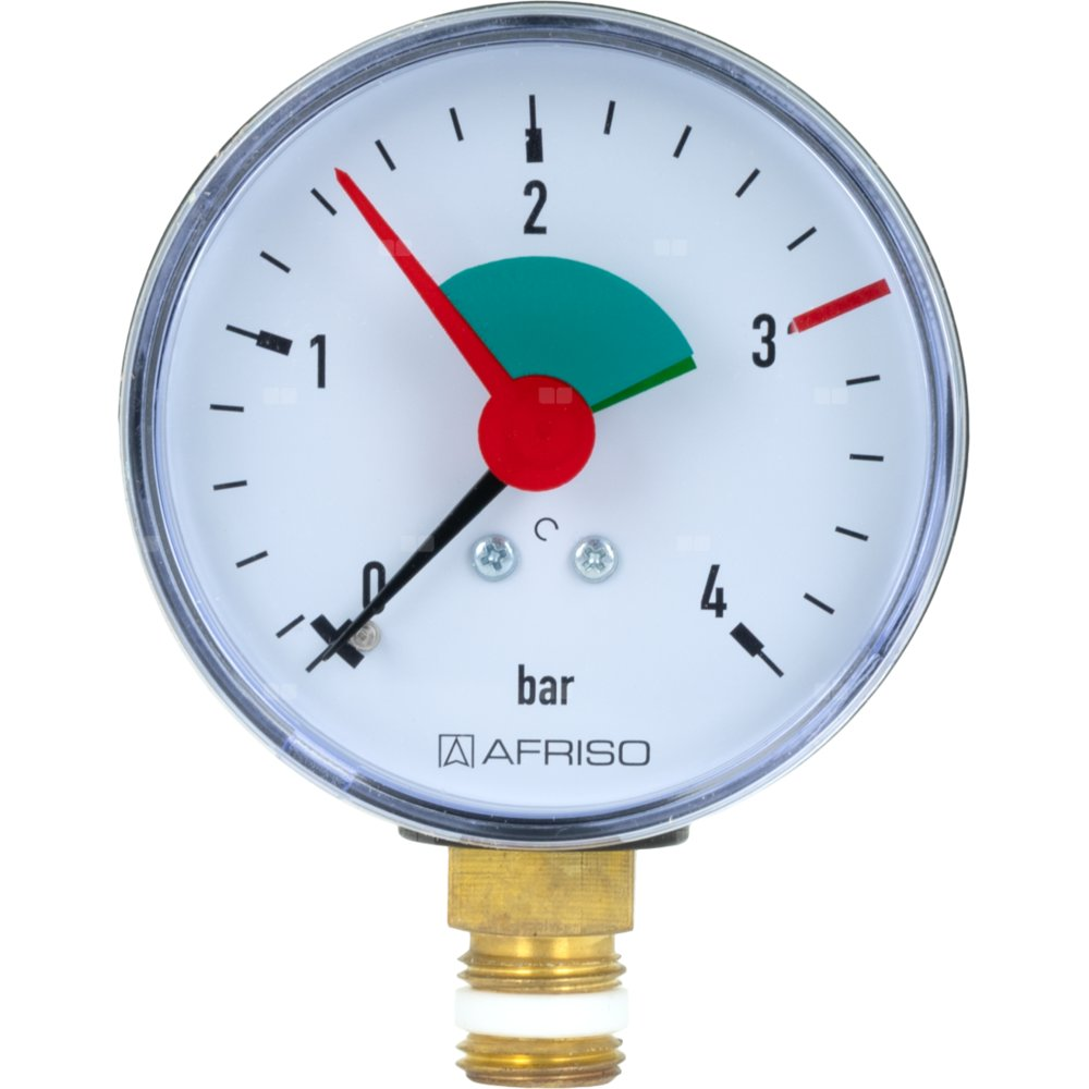 Przyrząd do zamkniętych instalacji grzewczych o Pmax 3 bar.Zielony obszar na tarczy wskazuje optymalny zakres ciśnienia.