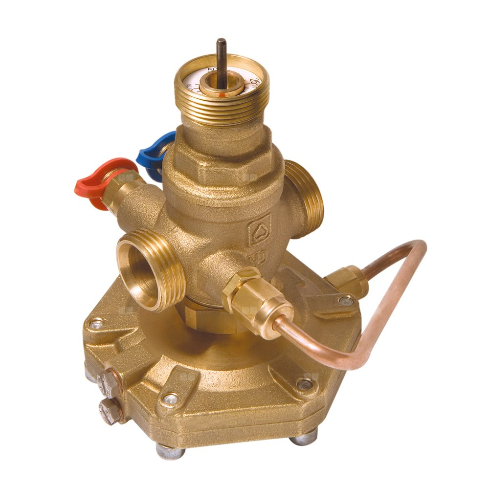 Regulator przepływu - Kombiventil. Wykonanie kompaktowe, korpus z mosiądzu odpornego na wypłukiwanie cynku, przyłącze z gwintem zewnętrznym DN 15 i DN 20 ze stożkiem, DN 25 do DN 50 z uszczelnieniem płaskim, 2 zawory pomiarowe do podłączenia miernika oraz wbudowana wkładka do współpracy z napędami i siłownikami, przyłącze M 28 x 1,5, skok 4,0 mm. Adaptery i złączki należy zamawiać oddzielnie. Napędy i siłowniki nie wchodzą w zakres dostawy.
