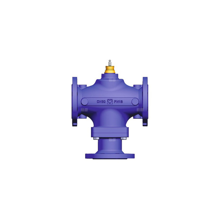 Zawór regulacyjny 3-drogowy HERZ, figura prosta z żeliwa szarego GJL 250 wg. EN 1561, z przyłączem kołnierzowym wg EN 1092-2, PN 16. Długość całkowita wg. EN 558-1, szereg podstawowy 1, charakterystyka równo procentowa. Materiał uszczelniający FPM. Maks. temperatura robocza: 140 °C.