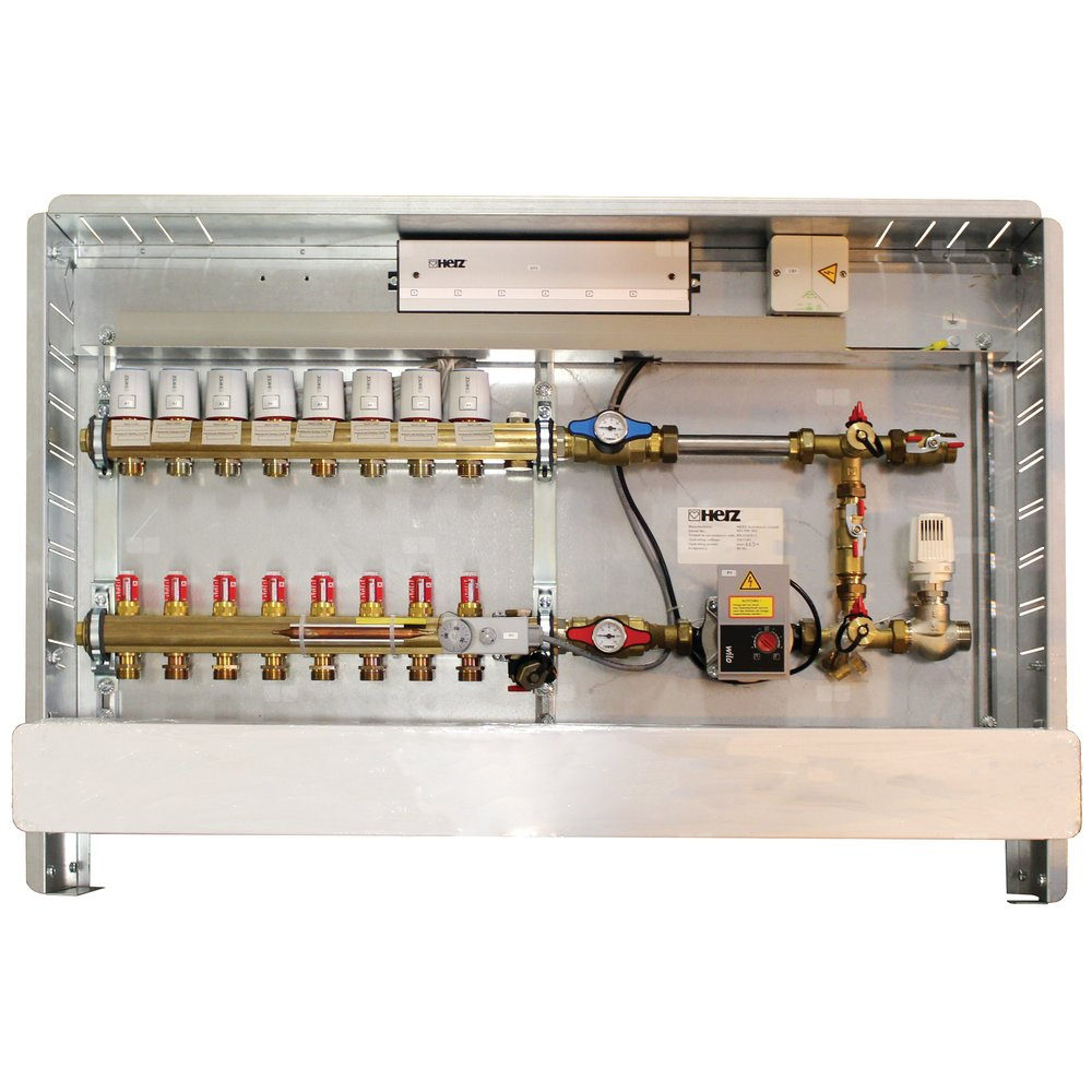 Kompletna stacja regulacyjna 230 V, 50 Hz, do ogrzewania podłogowego, przyłącze z prawej strony. Części składowe:- para rozdzielaczy mosiężnych, rozdzielacz zasilający z wkładkami regulacyjnymi z przepływomierzami, rozdzielacz powrotny z wkładkami termostatycznymi, odpowietrzenie, spust wody z przyłączem do węża, kołpaki końcowe - uchwyty - siłowniki termiczne do regulacji obwodów grzewczych - mechaniczna regulacja temperatury- zawór odcinający - elektroniczna pompa obiegowa - rozdzielacz elektryczny, z okablowaniem do siłowników termicznych - automatyczne zabezpieczenie przed przegrzaniem układu poprzez wyłączenie pompy Zestaw zamontowany w szafce z blachy stalowej ocynkowanej, rama oraz front drzwi pomalowane na biało metodą proszkową (RAL 9003). Regulowana głębokość (150-190 mm) oraz wysokość (720-805) mm, zdejmowana szyna do prowadzenia rur