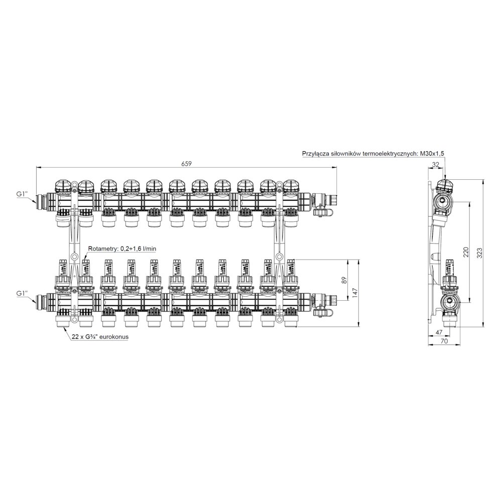 Rozdzielacz do ogrzewania podłogowego AFRISO ProCalida EF1 K 11-obieg. poliamid GZ 1'' x euroconus 3/4'' + przepływomierz + zawór napełn/spust