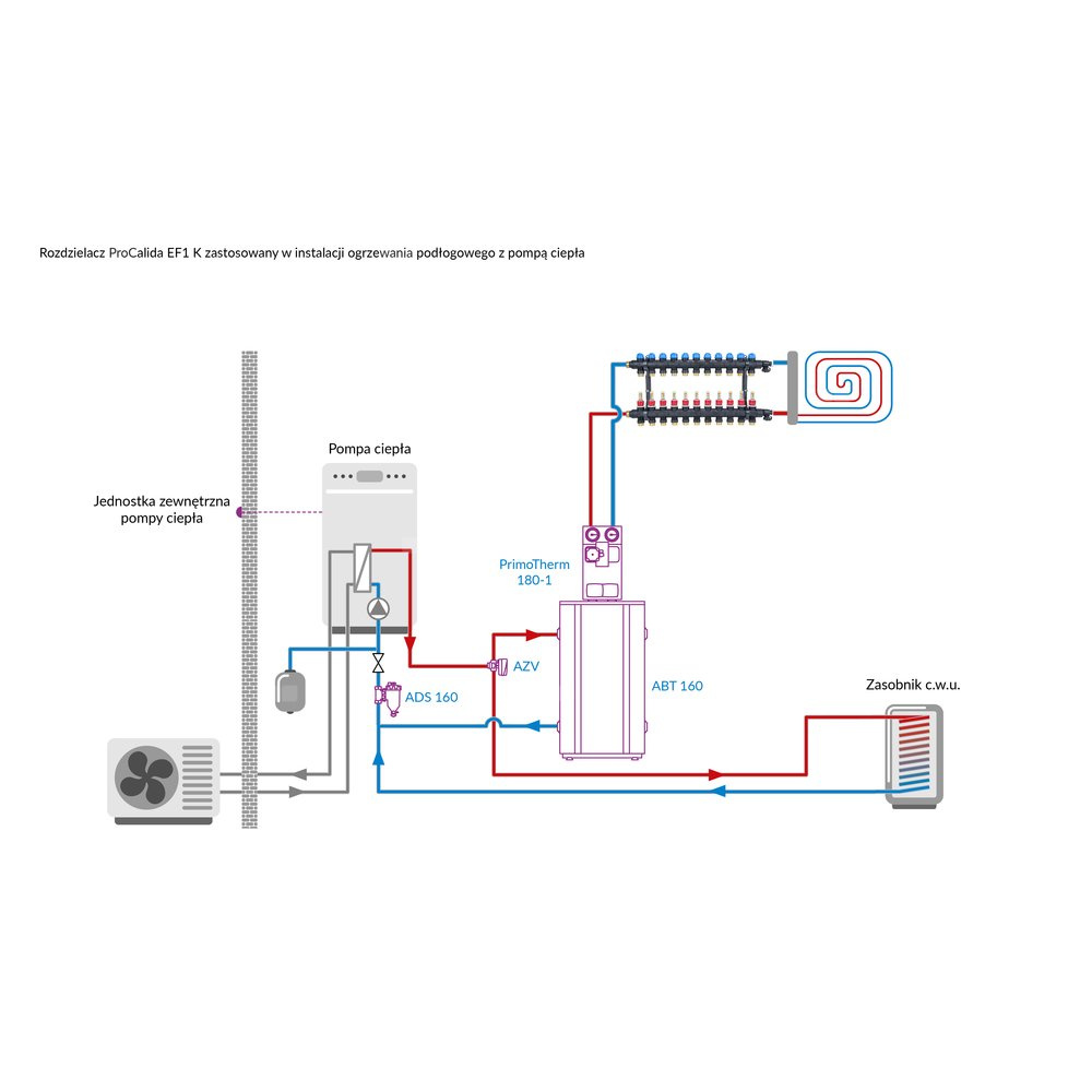 Rozdzielacze poliamidowe ProCalida EF1 K stosuje się w instalacjach ogrzewania lub chłodzenia płaszczyznowego. Montowane są głównie w szafkach umieszczonych w ścianach budynku, skąd rozprowadzają ciepło ze źródła do poszczególnych pętli instalacji płaszczyznowej. Możliwy jest również montaż pod stropem w instalacjach sufitowych. Z ich pomocą reguluje się ilość ciepła kierowaną do konkretnych pomieszczeń, napełnia, opróżnia oraz odpowietrza instalacje płaszczyznowe. Połączone z systemami sterowania FloorControl lub CosiTherm i siłownikami termoelektrycznymi TSA zapewniają stale komfortową temperaturę w każdym z pomieszczeń.