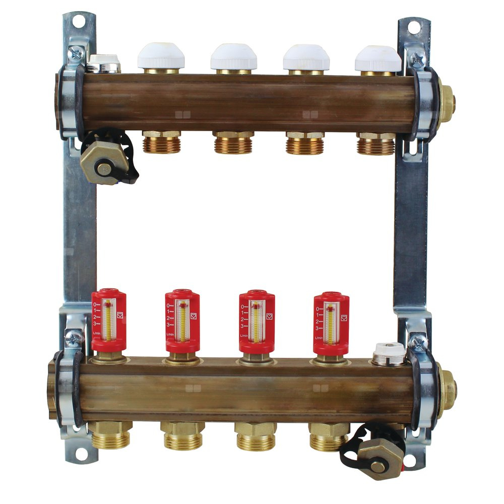 Rozdzielacz do ogrzewania podłogowego HERZ 10-obieg. mosiądz GW 1'' x GZ 3/4'' + przepływomierz + zawór napełn/spust + odpowietrznik