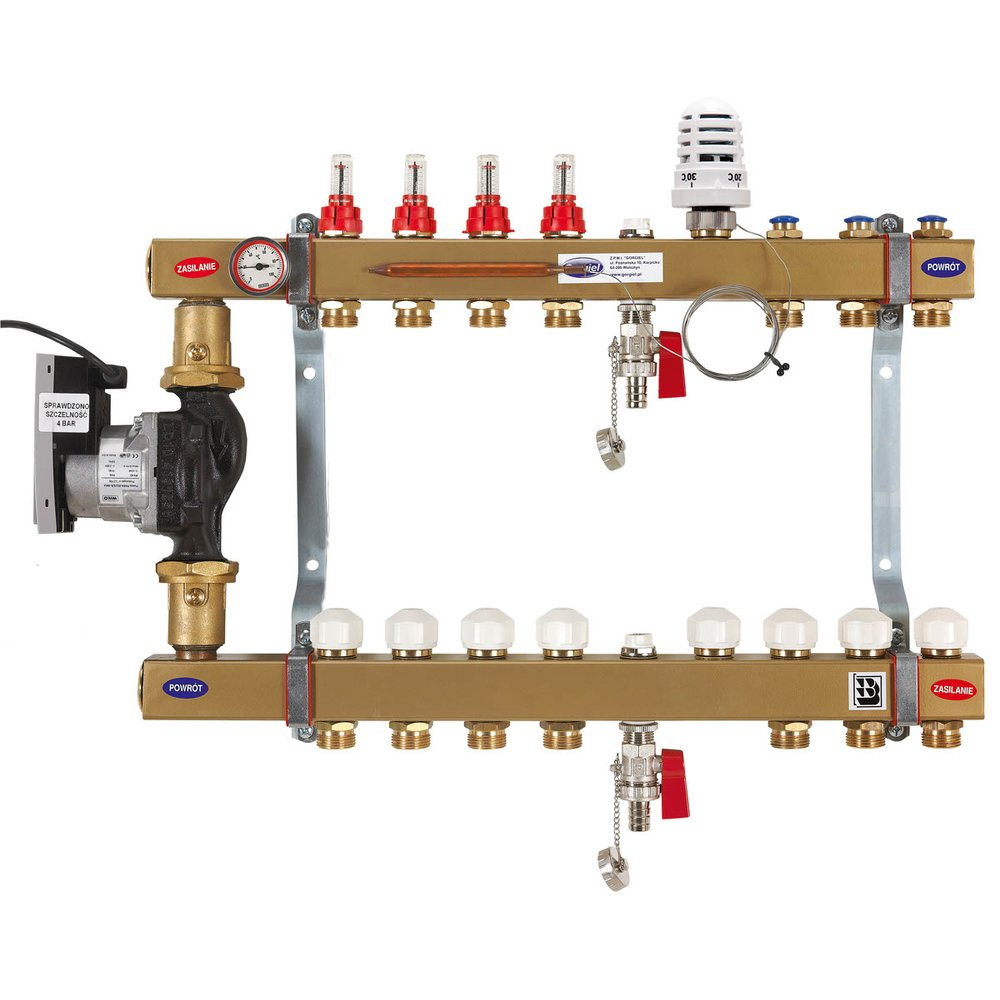 Wysokość: 500 mm, Szerokość: 670 mm, Głębokość: 105 mm, Ilość sekcji: 3:6, Układ DRS PTMe wyposażony w energooszczędną pompę, Rozdzielacz stalowy z pompowym układem mieszania do ogrzewania podłogowego i grzejnikowego w układzie zamkniętym. P-podłogówka, G-grzejniki