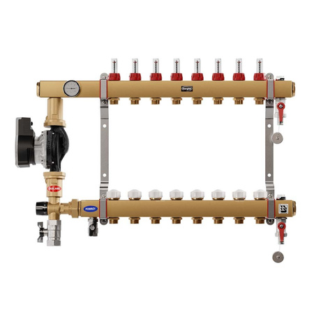 Wysokość: 450 mm, Szerokość: 680 mm, Głębokość: 95 mm, Ilość sekcji: 8, Układ wyposażony w pompę energooszczędną, Rozdzielacz stalowy z zaworem trójdrożnym (20-40oC) i pompowym układem mieszania do ogrzewania podłogowego w układzie zamkniętym.