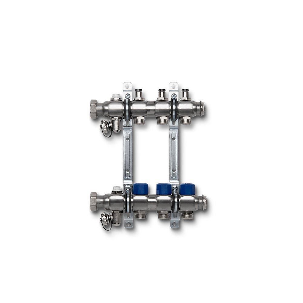 Rozdzielacz ze stali nierdzewnej. Wkładki termostatyczne na powrocie, uchwyt ścienny i zawór spustowy. 7