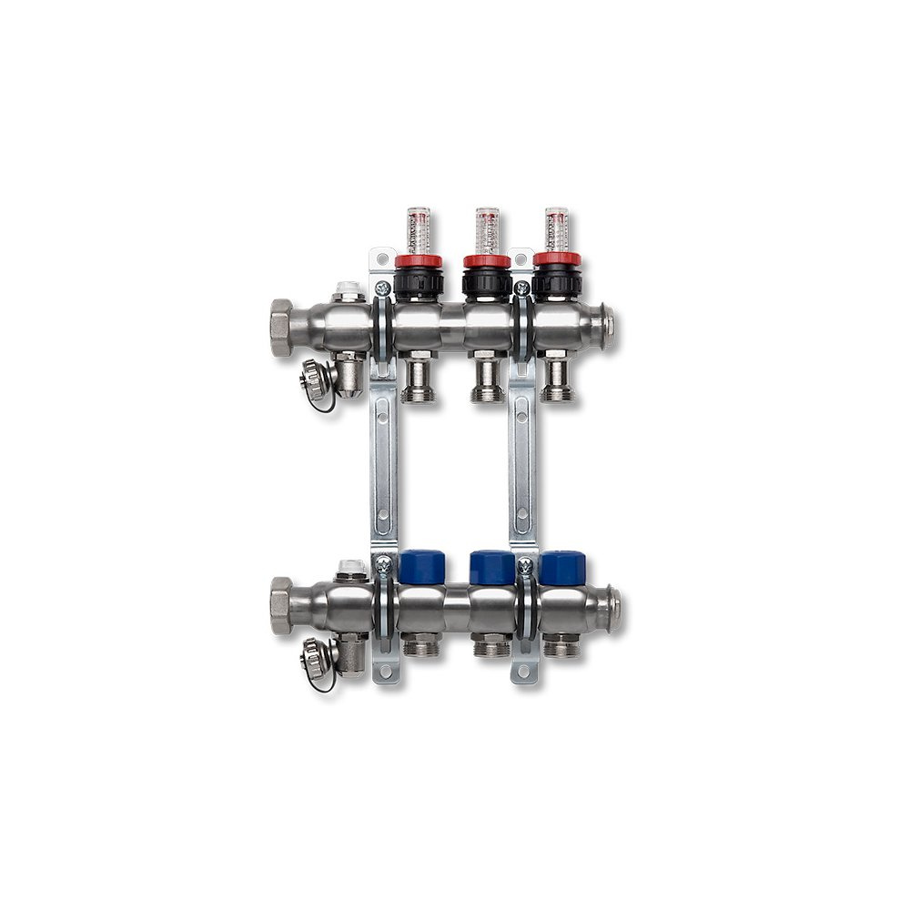 Rozdzielacz ze stali nierdzewnej z pomiarem i regulacją przepływu na zasilaniu. Wkładka termostatyczna na powrocie, uchwyt ścienny i zawór spustowy. 5