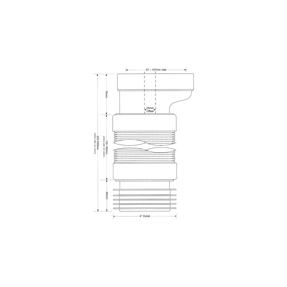 Przyłącze kanalizacyjne elastyczne z przesunięciem 20mm, o długości od 235 do 330mm Wejście 90-110mm z uszczelką wargową, wyjście 110mm z uszczelką kołnierzową.