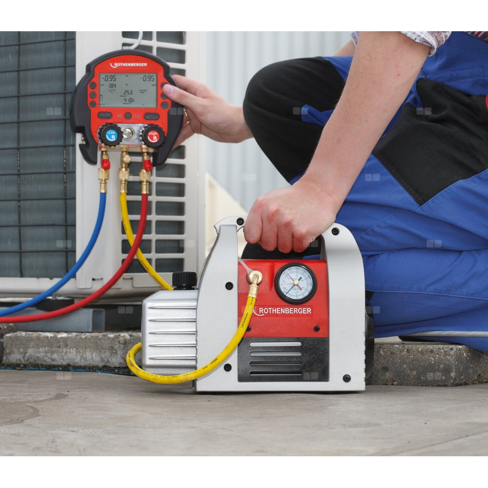 Rothenberger ROAIRVAC R32 6.0 służy do ewakuacji wszystkich obwodów chłodniczych zgodnie z DIN 8975. Dwustopniowa obrotowa pompa łopatkowa osiąga próżnię mniejszą niż 25 mikronów. To sprawia, że idealnie nadaje się dla wszystkich budowniczych instalacji chłodniczych i techników.