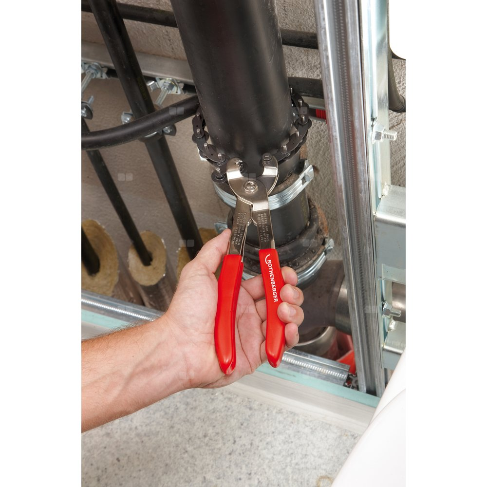 Mały obszar roboczy: do pracy w ograniczonej przestrzeni, na przykład na równoległych rurach. Komfort: stabilny łańcuch z 15 kółkami tnącymi, dwustopniowa regulacja, rękojeść pokryta tworzywem sztucznym