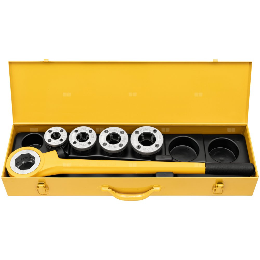 Ręczna gwintownica z szybkozmiennymi głowicami tnącymi. Wyjątkowo lekkie wejście w materiał i gwintowanie. Dźwignia z zapadką ze stali, grubo powleczona tworzywem. Tylko jeden rodzaj szybkowymiennych głowic gwintujących. Niezniszczalne wysokiej jakości noże gwintujące.