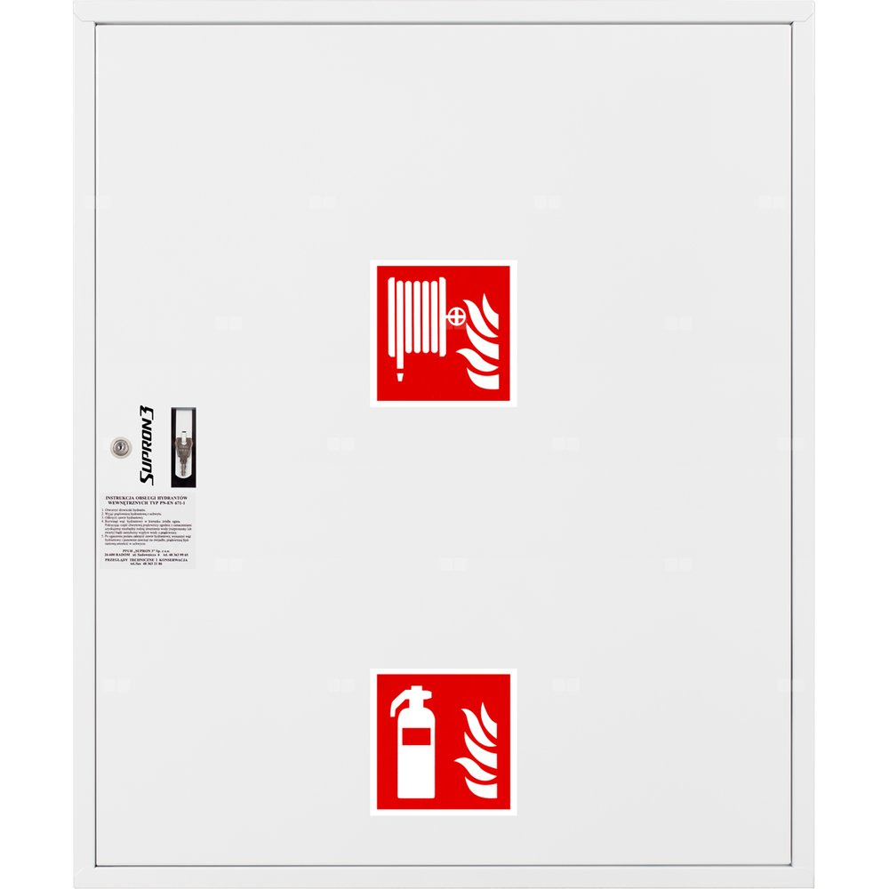 - szafka hydrantowa STANDARD wykonana z blachy czarnej malowanej farbą proszkową poliestrową fasadową typ Facade w kolorze czerwonym (RAL 3000) lub białym (RAL 9003), drzwi pełne; dzięki zastosowaniu zawiasu krytego drzwi szafki można otworzyć o 180°