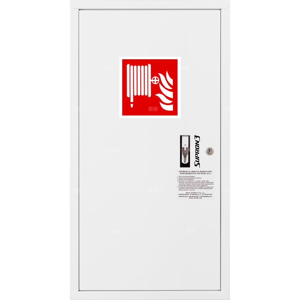 - szafka hydrantowa OCYNKOWANA wykonana z blachy stalowej ocynkowanej elektrolitycznie malowanej farbą proszkową poliestrową fasadową typu Facade w kolorze czerwonym (RAL 3000) lub białym (RAL 9003), drzwi pełne; dzięki zastosowaniu zawiasu krytego drzwi szafki można otworzyć o 180°