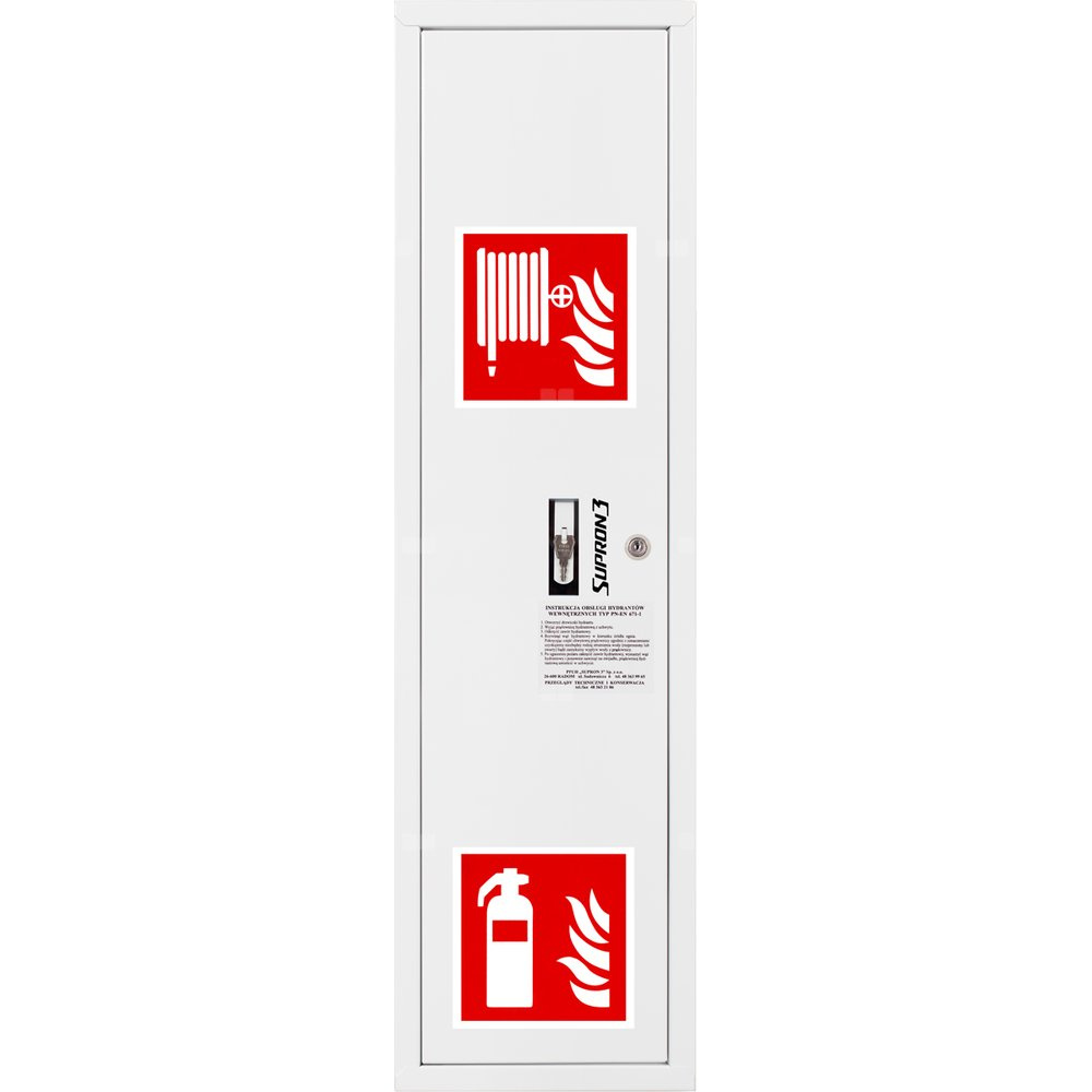 Hydrant DN 52 zawieszany boczny z koszem, z miejscem na gaśnicę, wąż 15 m, zamek patent, RAL 9003 lewy