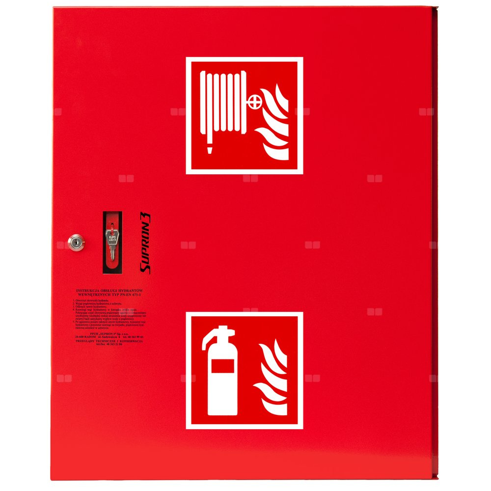 Hydrant DN52 zawieszany z koszem, 600x500x200mm, z miejscem na gaśnicę, wąż 15m, zamek patent, RAL 3000